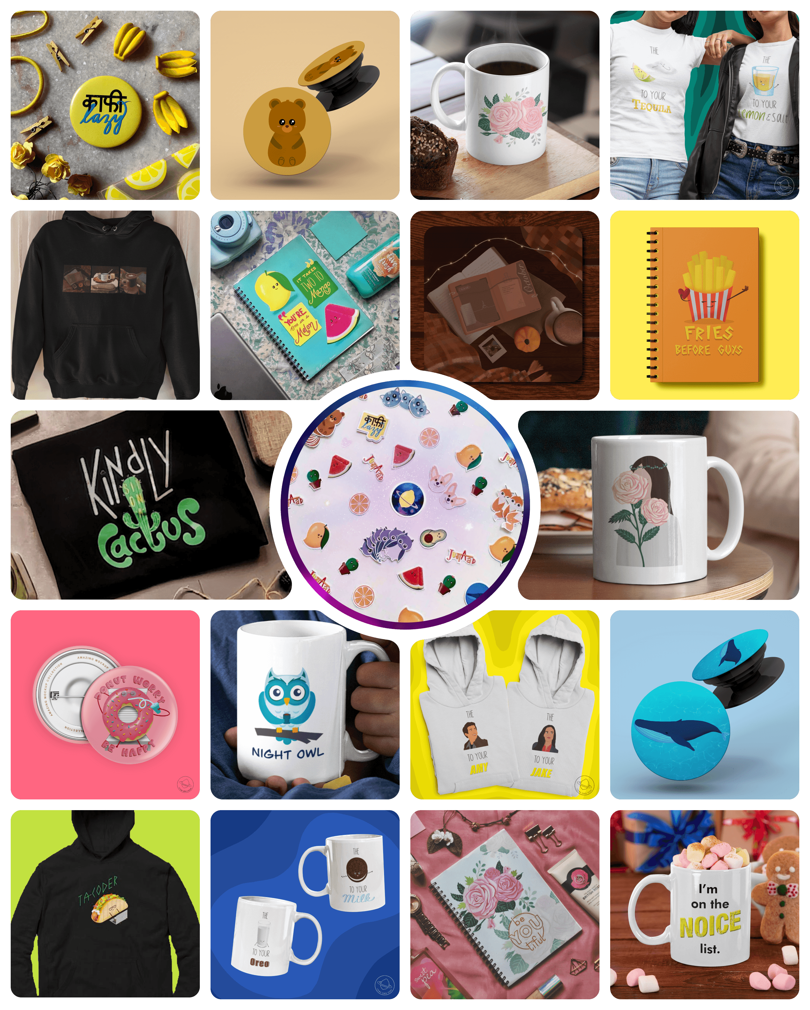 Our products range from stickers, badges, mugs and notebooks to even apparel such as t-shirts and hoodies. The collections have something for varied personalities with designs based on flora, fruit and fauna, tv shows, catch-phrases and seasonal and festive themes!