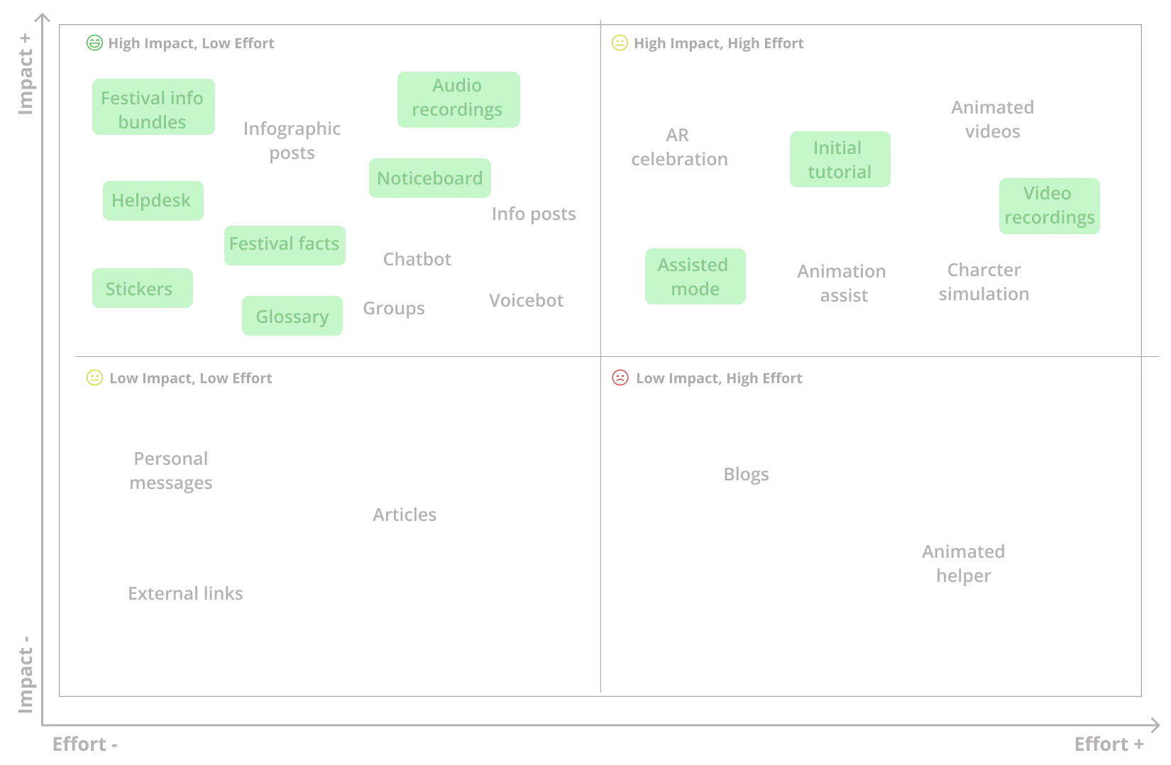 In order to make a qualitative decision and evaluate the various features that were brainstormed and mind-mapped, I plotted them against an impact-effort matrix. The green boxes indicate the top priority features.
