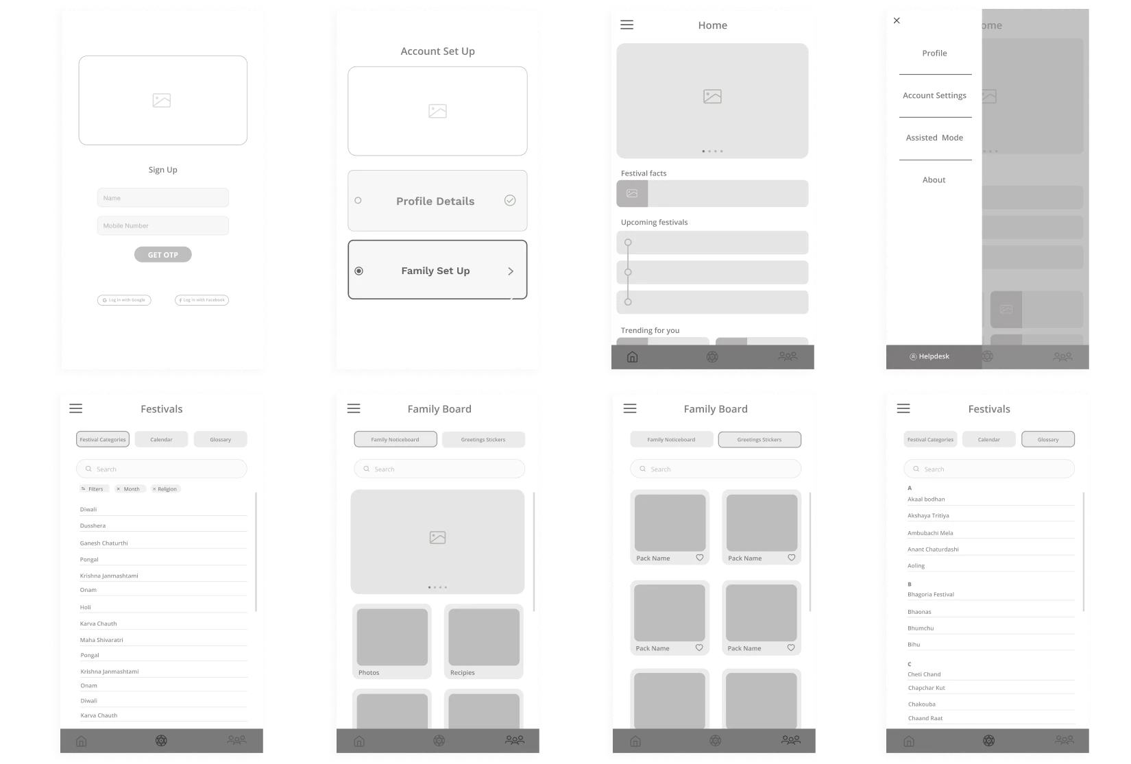 With families becoming increasingly nuclear and the younger generation living alone, it becomes harder to keep track of festivals and pass on traditions. Hence I explored designs to learn about various festivals and one's traditions.